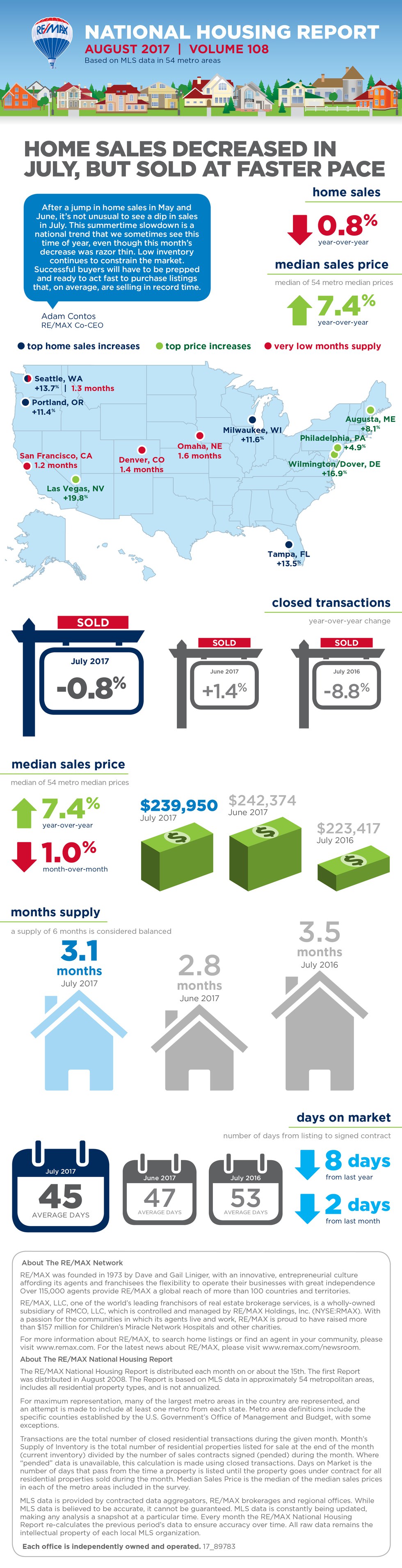 While inventory disappeared faster than a popsicle in July, slightly fewer (0.8 percent) homes sold, according to the August RE/MAX National Housing Report. The report analyzes real estate data in 54 metro areas across the U.S.